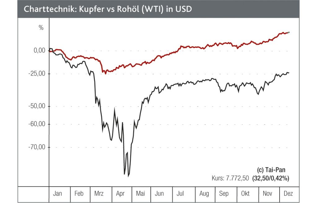 Kupfer und Erdöl gelten, unabhängig von den spezifischen Eigenheiten beider Märkte, als relativ gute Konjunkturindikatoren. Besonders bei Kupfer ist dies der Fall. Bereits früh im Jahr 2020 standen die Zeichen an beiden Märkten auf Sturm. Kupfer (vgl. Abb., rote Linie) sank in nur drei Monaten um rund 25%.