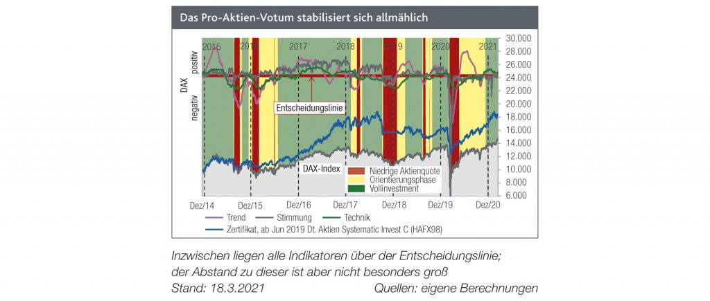 Noch in der letzten Ausgabe des Smart Investor hatten wir angemerkt, dass unsere Börsenampel zwar auf GRÜN steht, unsere Indikatoren jedoch nicht so richtig durchstarten wollen. Das hat sich inzwischen geändert: Sämtliche Indikatoren konnten ihre Entscheidungslinien überwinden. Ungetrübt ist die gesamte Situation trotzdem nicht, denn bei genauerer Betrachtung befinden sie sich allesamt noch immer in Reichweite zur Entscheidungslinie. Viel darf also nicht passieren und die Börsenampel würde recht schnell wieder auf GELB oder gar ROT umspringen. Insofern bleibt es spannend.