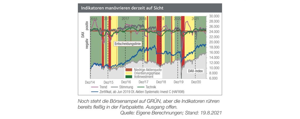 Vor dem Hintergrund des neuen Allzeithochs am deutschen Aktienmarkt (DAX und MDAX) hat das Pro-Aktien-Votum unserer Börsenampel in den vergangenen Wochen durchgehalten. Dabei konnte vor allem der Trendindikator seine Abwärtsbewegung stoppen und sich nach einer Bodenbildung wieder leicht stabilisieren.