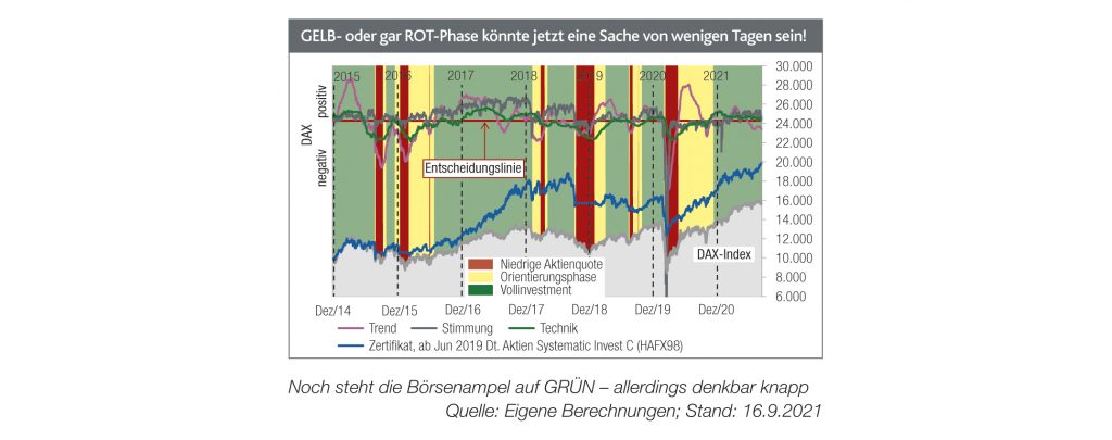Ein neues Allzeithoch in unserem Deutschlandfonds und eine scheinbar unaufgeregte Seitwärtsbewegung des deutschen Aktienmarkts – und dennoch rumort es bereits kräftig unter der Oberfläche. So hat einer unserer drei Indikatoren, der Trendindikator, schon im Juni seine Entscheidungslinie durchbrochen, und der Technikindikator steht offenbar kurz vor einem Signalwechsel.