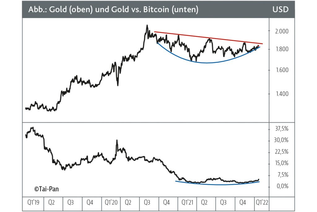 Nachdem die Aktienmärkte jüngst stärker unter Druck gekommen sind, fällt der Blick automatisch auf Alternativanlagen wie Rohstoffe, Edelmetalle und Kryptogelder. Insbesondere Gold und Bitcoin, die im weitesten Sinn als inflationsgeschützte Alternativgelder wahrgenommen werden, fechten seit Jahren ein Duell aus, das der Bitcoin mit seiner atemberaubenden Performance regelmäßig für sich entscheiden konnte – doch möglicherweise kündigt sich hier ein Gezeitenwechsel an.