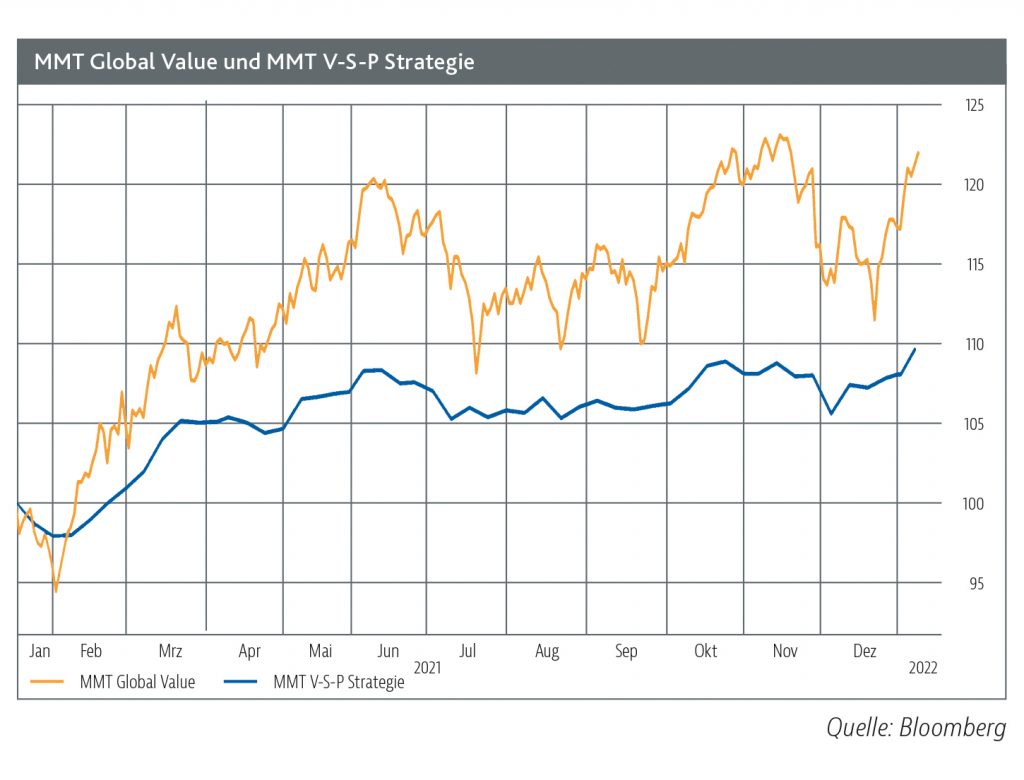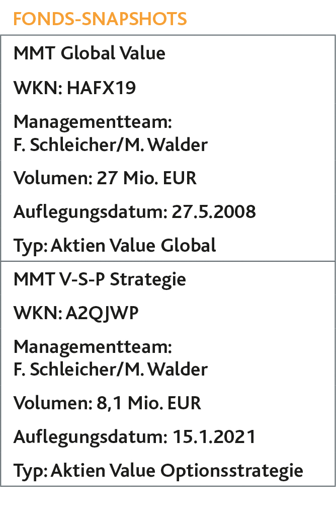 Im MMT Global Value betreiben die Portfoliomanager klassisches Value-Stock-Picking am Aktienmarkt. Für Anleger, die die Aktienvolatilität scheuen, bietet der im Januar 2021 aufgelegte MMT V-S-P Strategie eine Alternative. Das Konzept wurde bereits früher in verschiedenen Produkten umgesetzt und Januar 2021 in die Fondsfamilie MMT eingebracht. Im Fonds wird mittels einer Optionsstrategie ein Sicherheitsnetz gespannt. Zur zusätzlichen Generierung von regelmäßigen Einnahmen wird in der V-S-P-Strategie eine systematische Stillhalterstrategie umgesetzt. Ins Portfolio werden zudem Green Bonds beigemischt. Gemeinsam ist beiden Konzepten, dass bei der Aktienauswahl Value-Titel mit einer relativ hohen Dividendenrendite und starker Unterbewertung bevorzugt werden.