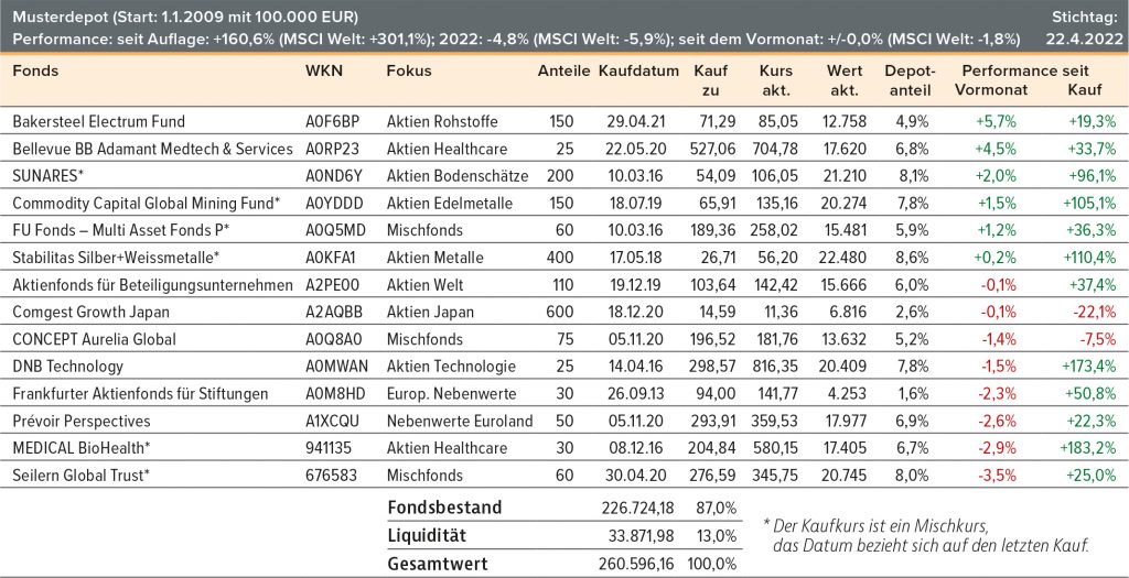 Im Vergleich zum Vormonat blieb das Fondsmusterdepot nahezu unverändert, während der MSCI World EUR um 1,8% abgegeben hat. Spitzenreiter auf Monatssicht war der Bakersteel Electrum Fund (WKN: A0F6BP; +5,7%), der in Minenunternehmen investiert, die Metalle für Zukunftstechnologien wie Elektromobilität und Robotik abbauen. In den kommenden Wochen erwarten wir weiter turbulente Börsen. Neben der Belastung durch Themen wie Inflation und Zinserhöhungen droht eine weitere Eskalation in der Ukraine. Vor diesem Hintergrund werden wir beim DNB Technology (WKN: A0MWAN), beim MEDICAL BioHealth (WKN: 941135) und beim Seilern Global Trust (WKN: 676583; mit -3,5% das Schlusslicht auf Monatssicht) Teilverkäufe realisieren. Details zu den Transaktionen finden Sie in unserem jeden Mittwochabend erscheinenden Newsletter Substanz Investor Weekly (www.substanzinvestor.de).