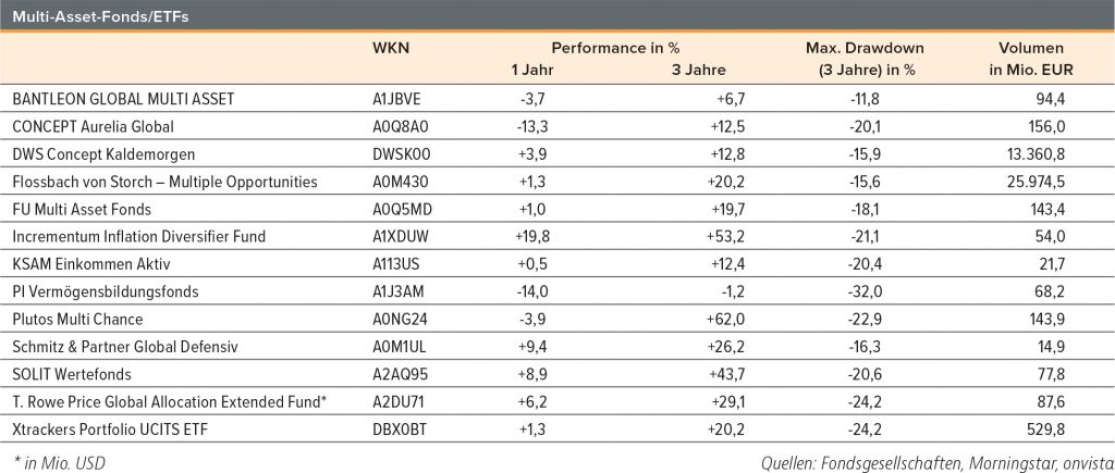 Im vermögensverwaltenden CONCEPT Aurelia Global (WKN: A0Q8A0) mischt Portfoliomanager Thomas Bartling Techaktien wie Intel und Alphabet mit Goldaktien, Edelmetallen (Ende März: 16,7%) und Cash (15,6%). In Substanz Investor 4/2022 auf S. 38 erläuterte er im Interview, wie er im Fonds auf die Schwäche des Techsektors reagiert. Aktuell leiden laut Bartling die Chipproduzenten unter Mangel an Neongas, das zu einem großen Teil aus den Regionen um Odessa und Mariupol stammt. Zur Risikoreduzierung können Aktien abgesichert werden. Der Fonds erwirtschaftete in drei Jahren 12,5% und damit mehr als die Vergleichsgruppe „Mischfonds EUR flexibel — Global“ mit 9,2%.