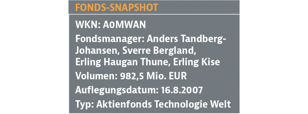 Der DNB Fund Technology wird von vier Portfoliomanagern gelenkt, wovon zwei bereits seit Auflage des Fonds (2007) dabei sind: Anders Tandberg-Johansen und Sverre Bergland. Die beiden anderen Herren, Erling Thune (seit 2008 dabei) und Erling Haugan Kise (seit 2014), komplettieren das Portfoliomanagement. Jeder Manager hat sein Spezialgebiet: So kennt sich Tandberg-Johansen beispielsweise in den Bereichen Hardware und Halbleiter bestens aus, während der Kollege Thune eher in den Sektoren Telekom und Medien zu Hause ist. Jeder trifft innerhalb seines Zuständigkeitsbereichs eigene Entscheidungen. Soll eine Position hoch gewichtet werden, wird dies innerhalb des Teams besprochen. Der Fonds unterscheidet sich von den meisten Mitbewerbern darin, dass das größte Augenmerk auf dem Faktor „Bewertung“ liegt, es wird ein Value- und Contrarian-Stil verfolgt. Die am Markt heißgeliebten High-Valuation- bzw. High-Growth-Aktien suchte man in der Boomphase im Portfolio vergeblich.