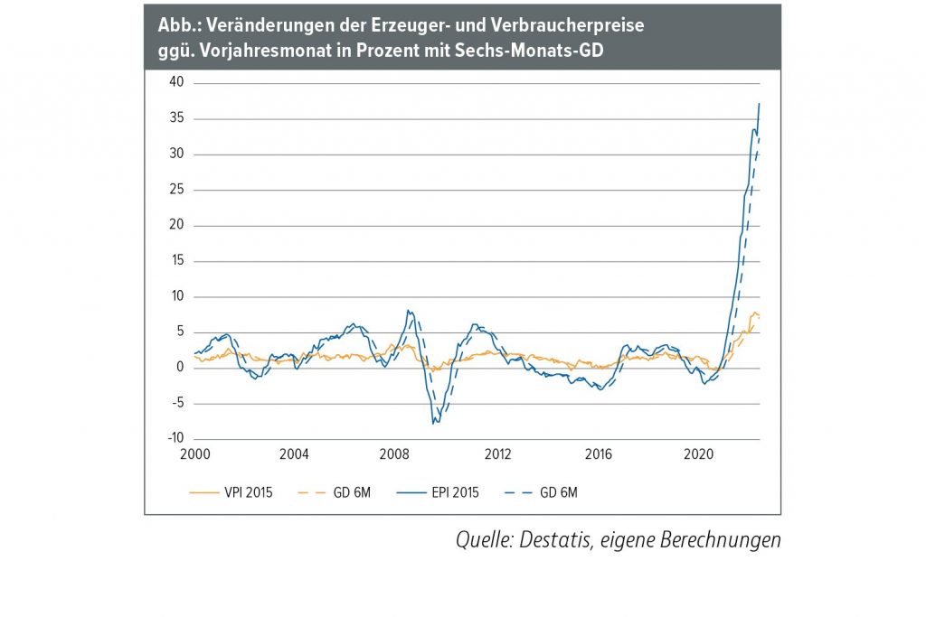 Volkswirtschaftliche Daten werden üblicherweise nicht charttechnisch analysiert. Dennoch zeigen sich auch hier Trends, weshalb wir diesmal den Versuch unternehmen wollen, die Veränderungen der Verbraucherpreise (vgl. Abb., VPI 2015, orange Linie) und der Erzeugerpreise (EPI 2015, blaue Linie) als Chartbild zu deuten.