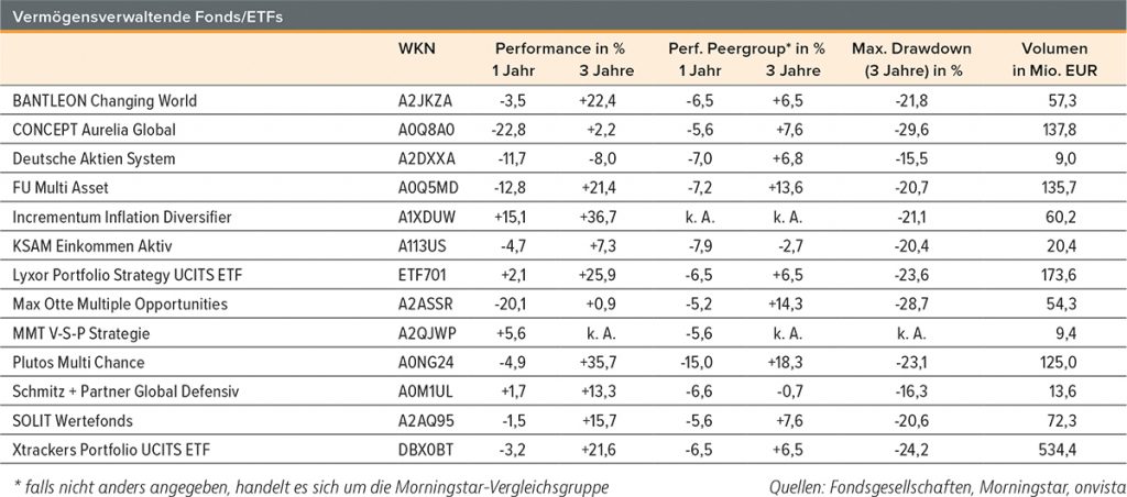 Vor allem auf werthaltige Aktien und Edelmetalle setzt der Max Otte Multiple Opportunities (WKN: A2ASSR; +0,9% in drei Jahren). Einen Blick in das Innenleben des Fonds erhalten Sie in der Fondsanalyse (S. 30). Im Deutsche Aktien SYSTEM (WKN: A2DXXA; -8,0% in drei Jahren) wird regelbasiert in die trendstärksten Titel aus DAX, MDAX, TecDAX und SDAX investiert. Gibt es keine Kaufsignale, kann 100% Cash gehalten werden. Mehr Details zum Fonds finden Sie im Fondsinterview mit Roman Kurevic auf S. 34.