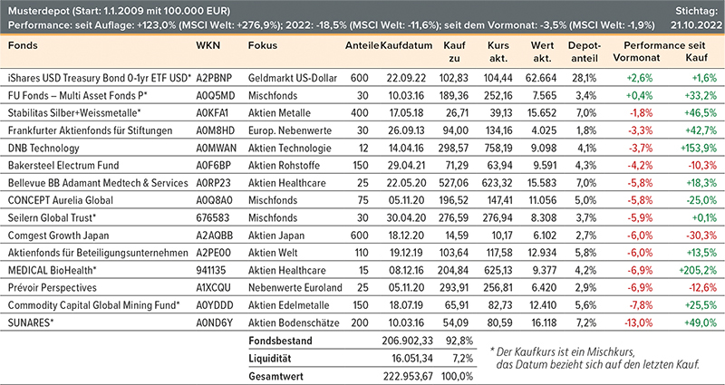 Im Vergleich zum Vormonat hat das Fondsmusterdepot mit -3,5% deutlicher verloren als der MSCI World EUR (-1,9%). Klar ist, dass die Stabilisierung des Depots durch Rohstoff- und (Edel-)Metallfonds in der von uns erwarteten Krise bislang nicht funktioniert hat. Mit -13% auf Monatssicht trägt der SUNARES (WKN: A0ND6Y) die rote Laterne. Die Kurseinbrüche der Renewables-Aktien SolarEdge Technologies und Plug Power in den vergangenen Wochen mit -35,0 bzw. -42,5% haben den Fonds belastet. Am 22.9. wurde durch den Kauf weiterer 200 Anteile des iShares USD Treasury Bond 0-1yr ETF USD (WKN: A2PBNP; Kaufkurs: 104,40 EUR) der bisherige Bestand aufgestockt. Mit dem Parken von Liquidität in US-Kurzläufern soll das Depot von der Schwäche des Euro gegenüber dem Greenback abgesichert werden.