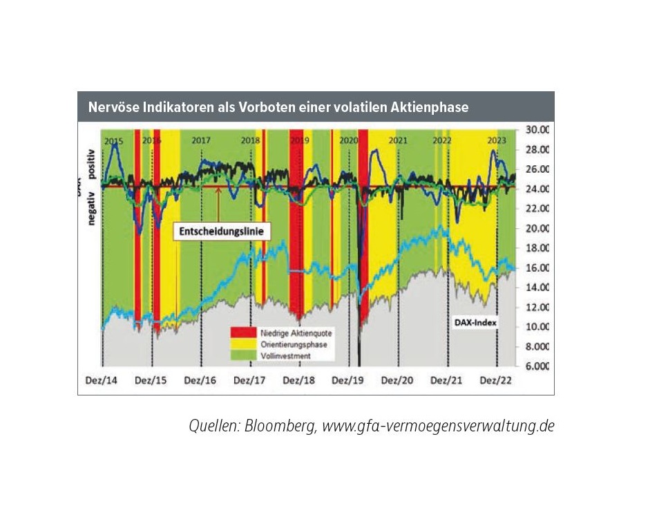 Der seit einigen Monaten anhaltende Seitwärtstrend auf den Aktienmärkten hinterlässt bei unseren Indikatoren seine Spuren. Technik und Trendstärke lassen nach, sie sind inzwischen ihren Ausstiegsschwellen gefährlich nahegekommen.
