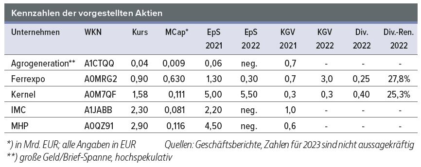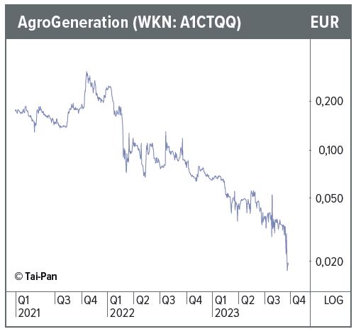 Probleme anderer Natur hat der kleine Getreideproduzent AgroGeneration. Alle Anbauflächen der Gesellschaft liegen in der nordöstlichen Region Charkiw, die im Jahr 2022 stark umkämpft war. Dementsprechend litt AgroGeneration von allen im Westen börsennotierten Unternehmen am stärksten unter dem Krieg. Allein direkte Kriegszerstörungen schlugen 2022 mit 15 Mio. USD auf die Bilanz. Am Ende stand ein Jahresverlust von 30 Mio. USD. Für ein Unternehmen mit nur noch 10 Mio. USD Börsenwert ist dies existenzbedrohend. Umgekehrt dürfte AgroGeneration bei einem schnellen Ende des Kriegs das größte Kurspotenzial haben.