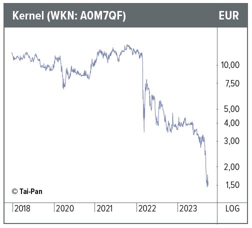 Kernel konnte bisher sämtlichen Widrigkeiten trotzen und im zweiten Halbjahr 2022 schon beinahe wieder an das Rekordgeschäftsjahr 2021 anschließen. Der größte ukrainische Produzent von Sonnenblumenöl und Getreide verdiente in der Erntesaison 2022 rund 370 Mio. USD. Dem steht eine Marktkapitalisierung von inzwischen nur noch 100 Mio. USD gegenüber. Trotz Fabelzahlen wie einem KGV von 0,25 und einem KBV von 0,05 hat sich Kernel von allen in Deutschland handelbaren ukrainischen Agraraktien am schlechtesten entwickelt. Die Ursache dafür ist vermutlich bei dem Mehrheitseigner und Gründer des Unternehmens, Andrij Verevski, zu suchen: Über die von ihm kontrollierte Holding Namsen Limited hat er zuletzt 75% von Kernel erworben und versucht nun, die Minderheitsaktionäre hinauszudrängen und das Unternehmen von der Börse zu nehmen. Inzwischen hält Verevski 74% der Anteile. Die übrigen Aktionäre haben sein Abfindungsangebot von 4,08 EUR pro Aktie abgelehnt. Inwieweit er die Aktionäre nach ukrainischem Recht zwangsabfinden kann, ist derzeit unklar. Amerikanische und skandinavische Investoren klagen derzeit gegen die Pläne. Haben sie Erfolg, bleibt Kernel die wahrscheinlich günstigste Aktie der Welt.