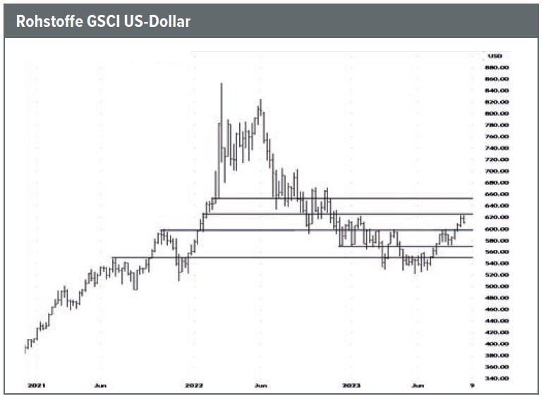 Seit Erreichen seines Tiefs Ende Mai dieses Jahres legte der Rohstoffsektor gemessen an einem übergreifenden Index wie dem S&P GSCI in der jüngst erreichten Spitze um mehr als 19% zu, selbst die massive Rally des US-Dollar der letzten zwei Monate verursachte lediglich moderate Dellen im Preischart. Anders als bei Indizes anderer Assetklassen bilden die Vertreter der Rohstoffwelt den Markt jedoch konstruktionsbedingt nicht sonderlich breit ab. Eingangs erwähnter Index gewichtet den aus Erdöl, Ölprodukten und Erdgas bestehenden Energiesektor mit 61,5%! So nimmt es wenig Wunder, dass sich die Performance des Gesamtmarkts im Wesentlichen darauf zurückführen lässt: Erdöl und Diesel stiegen von Ende Juni bis Mitte September um 38% (WTI) resp. 48% (Diesel) an. Die Terminkontrakte auf Dieselkraftstoff haben in Europa und den USA mittlerweile saisonale Zehnjahreshochs erreicht. US-Rohöllagerbestände deutlich unter ihrem langjährigen Mittel, eine dort leergepumpten strategischen Reserve, überraschend bis zum Jahresende ausgedehnte Förderkürzungen der OPEC+-Gruppe, ein sich für das vierte Quartal abzeichnendes Zehn-Jahres-Angebotsrekorddefizit und Raffinerien, die Mühe haben, genügend Kraftstoff zu produzieren – all dies bildet geradezu den perfekten Sturm für diesen Sektor und rechtfertigt durchaus die sich stetig erhöhende Zahl derer, die eine weitere Rally bis deutlich in den dreistelligen Bereich bei WTI und Brent vorhersagen. Da allein diese Situation die zerbrechliche Erholung Chinas beeinträchtigen und darüber hinaus zu einer weiteren Inflationswelle führen könnte, dämpft dies die Fantasie an anderer Stelle. Zwar konnten sich Basismetalle wie Eisenerz und Kupfer ebenso wie die Edelmetallvertreter Platin und Silber mittlerweile von ihren Mehrmonatstiefs erholen, dennoch trüben insbesondere die chinesischen Wirtschaftsaussichten und die erwartbaren Folgen eines neuerlichen Inflationsschubs auch jene der Metallmärkte ein. Der Goldpreis trotzt indes in beeindruckender Weise sowohl dem wieder erstarkten US-Dollar als auch den stabilen Anleiherenditen, befindet sich jedoch aus technischer Sicht in einer Position mit Rückschlagpotenzial.