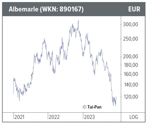 Allerdings wird diese Aufgabe dadurch erschwert, dass der Ölkonzern ExxonMobil jüngst den eigenen Einstieg in die Lithiumproduktion angekündigt hat. Vor diesem Hintergrund ist selbst bei einem Platzhirsch wie Albemarle (siehe Ausgabe 4/2023), der als der größte Lithiumproduzent der Welt gilt, der Aktienkurs in die Knie gegangen. Angesichts der wie skizziert schwierigen Ausgangslage am Lithiummarkt hat das Researchhaus Jefferies Anfang Dezember die Gewinnschätzungen je Aktie für diesen Titel deutlich gesenkt – und zwar von 6,80 auf 6,00 USD für 2024 und von 12,50 auf 2,40 USD für 2025. Die Aussicht darauf, dass auch andere Broker ihre Ergebnisprognosen noch senken, stellt eine Bürde dar.