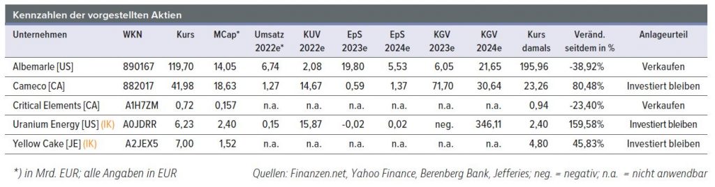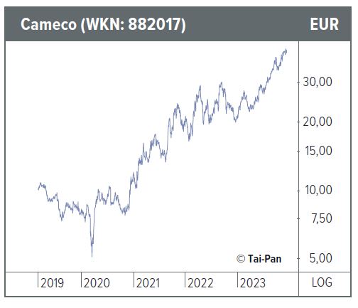 Cameco (siehe Smart Investor 5/2023) gilt als einer der größten Uranproduzenten der Welt. Die gute Wettbewerbsposition beruht auf dem kontrollierenden Besitz der weltweit größten hochgradigen Reserven und kostengünstigen Anlagen sowie auf bedeutenden Investitionen in den gesamten Kernbrennstoffkreislauf, einschließlich Beteiligungen an Westinghouse Electric Company und Global Laser Enrichment. Bei einem anhaltenden Anlegerinteresse am Thema Uran dürften diese Aktien für institutionelle Anleger allein schon aus Liquiditätsgründen mit die erste Wahl sein.