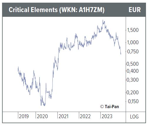 Als Explorer agiert Critical Elements Lithium (siehe Smart Investor 3/2022) in einer tieferen Liga als Albemarle; das ändert aber nichts daran, dass auch hier die Notiz klar in einem Abwärtstrend steckt. Das zu 100% firmeneigene, hochreine Rose-Lithium-Tantal-Projekt in Quebec birgt zwar Potenzial, wenn man einer Machbarkeitsstudie Glauben schenkt, denn darin wird der interne Zinsfuß nach Steuern für das Projekt auf 65,7% taxiert, mit einem geschätzten Nettogegenwartswert nach Steuern von 2,2 Mrd. USD bei einem Abzinsungssatz von 8%. Trotzdem ist zu befürchten, dass der Kurs erst vorwärtskommt, wenn der Lithiumpreis den Dreh nach oben findet. Weil das aber noch dauern kann, sind Lithiumaktien aktuell nicht erste Wahl.