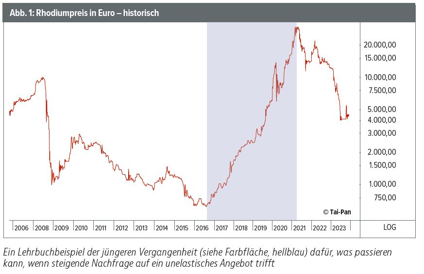Dass in angespannten Rohstoffmärkten verrückte Dinge möglich sind, zeigte auch und vor allem das Metall Rhodium. Dieses gehört zur Gruppe der Platinmetalle und hat einige besondere chemische Eigenschaften, die es für den Einsatz in Autokatalysatoren prädestinieren. Mitte der 2010er-Jahre hat nun die chinesische Regierung die Abgasvorschriften immer weiter verschärft, sodass die chinesischen Autobauer Platin und Palladium durch Rhodium ersetzen mussten. Da es keine eigenständigen Rhodiumminen gibt und das Metall nur spärlich als Beiprodukt bei der Platinproduktion anfällt, war das Angebot praktisch unelastisch. Die Nachfrage nahm aber trotzdem stetig zu, da die Kosten von wenigen Gramm Rhodium pro Katalysator im Vergleich zum Kaufpreis der Neuwagen immer noch überschaubar waren. Als nun die steigende Nachfrage auf das unelastische Angebot traf, verfünfzigfachte sich der Preis für die Unze Rhodium von 600 USD Mitte 2016 bis auf 30.000 USD im April 2021.