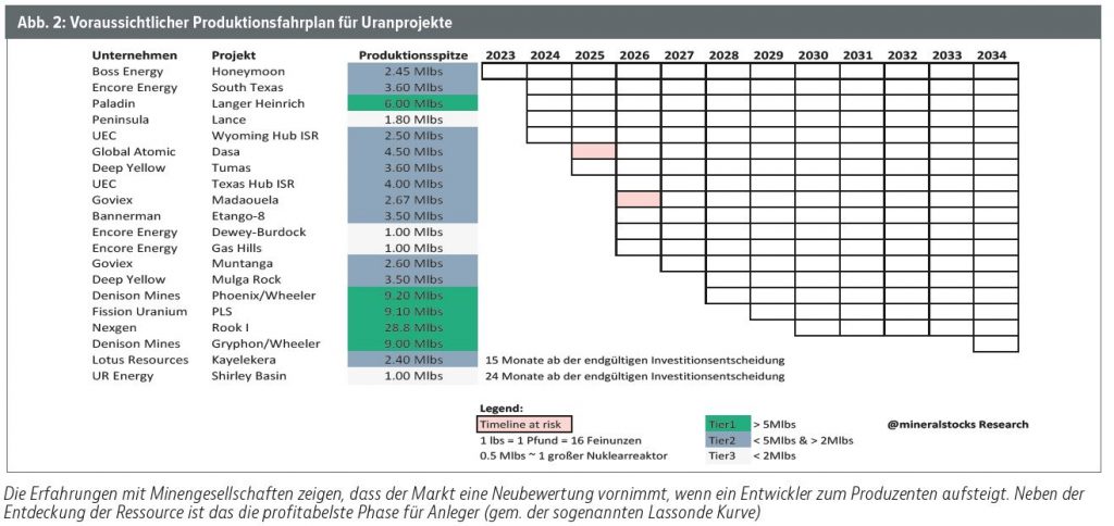 Lässt man den unwahrscheinlichen Fall eines schweren nuklearen Unfalls einmal außen vor, bleibt die Angebotsausweitung als einziges plausibles Szenario, das den Uranpreisanstieg stoppen könnte. Zwar sind derzeit einige kleinere Minen im Bau – jedoch reicht deren Volumen nicht ansatzweise, um das Defizit zu decken. So dürfte Paladins Langer-Heinrich-Mine in Namibia, die Anfang 2024 wieder in Betrieb genommen wird, gerade einmal die zusätzliche Nachfrage durch die Neubauten eines Jahres decken. Encores Projekt in Texas läuft derzeit an, sollte aber im ersten Jahr auch nur 800.000 Pfund bringen. Das ist eine ganze Menge für Encore, das seine weitere Expansion nun aus dem Cashflow finanzieren kann – aber nur ein Tropfen auf den heißen Stein für den Markt.