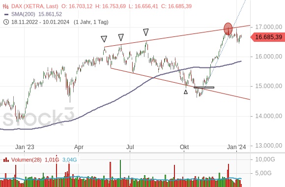 Wie schon angedeutet, konnte der DAX im neuen Jahr nicht dort weitermachen, wo er im letzten Jahr aufgehört hatte. Genauer gesagt, zeigte sich schon damals ein Warnhinweis (rote Markierung), der vor dem Hintergrund des vielwöchigen steilen Aufwärtstrends ernst zu nehmen war. Gleich am 2. Januar versuchte der DAX noch einmal einen Anlauf auf die Widerstandslinie durch die letzten Allzeithochs, scheiterte aber noch während der Sitzung. Die erreichten Kurshöhen verlockten damit innerhalb weniger Handelstage zum zweiten Mal zu deutlichen Gewinnmitnahmen. Am zweiten Handelstag erfolgte dann sogar ein kleiner Kursrutsch. Damit zeigt sich im DAX mit dem Jahreswechsel ein charakteristischer Wechsel in der Art des Kursgeschehens. Auch wurde der sehr steile Aufwärtstrend seit Ende Oktober 2023 gebrochen. Dies bedeutet nun allerdings nicht, dass der deutsche Leitindex nun zwangsläufig auf Tauchstation gehen muss, eine Konsolidierung wäre nach der jüngsten Rally allerdings mehr als verdient. Im Moment ist das Kursgeschehen – auch aufgrund der leicht rückläufigen Umsätze – noch mit einer Flaggenformation kompatibel, die lediglich ein Zwischenspiel wäre und sich letztlich trendbestätigend nach oben auflösen würde.