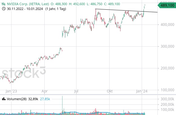 Für Aktionäre von Nvidia gibt es eine weitere gute Nachricht. Nicht nur, dass der Titel schon 2023 der Starperformer im NASDAQ-100 war, die Aktie konnte zuletzt sogar wieder neue Allzeithochs erzielen. Ein Value-Schnäppchen ist der Konzern zwar nicht, eher das Gegenteil, aber die Zuwachsraten bei Umsätzen und Gewinnen sind eindrucksvoll. Egal ob Künstliche Intelligenz, Virtual Reality oder Bitcoin, an den Prozessoren von Nvidia führt derzeit kaum ein Weg vorbei. Möglicherweise bleibt Nvidia auch im laufenden Jahr eine der inspirierenden Aktien des Tech-Sektors insgesamt. Zu etwas Vorsicht muss dennoch gemahnt werden, denn ambitionierte Bewertungen im Technologiebereich beinhalten immer auch ein Gefährdungspotenzial für den Kurs. Durchaus möglich, dass in Zukunft einer der Konkurrenten die Lücke zu Nvidia schließen und damit die Quasi-Monopolstellung bei den Spitzenchips ins Schwanken bringen wird. Der Markt ist zu attraktiv, die Renditen zu hoch, als dass die Konkurrenz nicht wenigstens versuchen würde, in die Domäne von Nvidia einzubrechen.