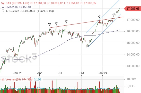 Und weiter geht es mit Allzeithochs beim DAX. Am heutigen Mittwoch riss der deutsche Leitindex sogar die Marke von 18.000 Punkten. Das ist bemerkenswert, denn erst vor gut einem Monat, am 6. Februar, schloss der Markt erstmals über 17.000 Punkten. Dieser Tausenderschritt wurde also in Rekordzeit genommen. Eine kleine einschränkende Anmerkung muss allerdings gemacht werden, da die Bedeutung dieser Stufen mit immer höheren Kursen abnimmt. Prozentual entspricht diese 1.00-Punkte-Stufe gerade einmal einem Plus von 5,88%.
