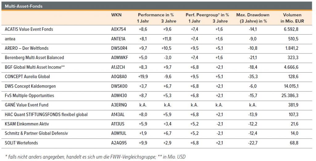 Der KSAM Einkommen Aktiv (WKN: A113US; +3,4% in drei Jahren und damit mehr als die Peergroup) aus dem Hause Kontor Stöwer Asset Management (KSAM) ist defensiv ausgerichtet. Auf der Rentenseite kann eine breite Palette genutzt werden, die z.B. Staats-, Unternehmens- und Wandelanleihen umfasst. Im Aktiensegment sind sogenannte Value Builder zu etwa 25% im Portfolio vertreten. Diese Unternehmen sind u.a. gut mit Eigenkapital ausgestattet und in der Lage, hohe Margen zu erwirtschaften. Hinzu kommen Investments in Edelmetalle (maximal: 10%). Auf S. 32 lesen Sie ein Interview mit Dirk Stöwer von KSAM.