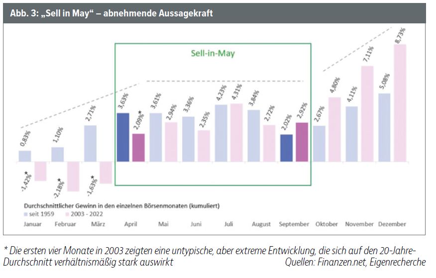 Nach wie vor entwickeln sich die Sommermonate schwächer als die Wintermonate – aber eine sklavische Ausführung von „Sell in May“ ist auf Basis neuerer Daten nicht mehr zeitgemäß. Dagegen sprechen hohe Transaktionskosten auf der einen und ungenutzte Chancen auf der anderen Seite. Aktuell sollten Anleger vielmehr das Gesamtbild nicht aus den Augen verlieren, etwa die Frage, wann die Zinswende kommt.