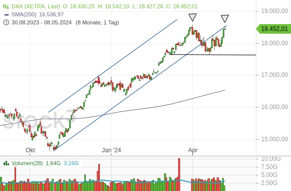 Einen erneuten Versuch zur Rückeroberung des steilen Aufwärtstrendkanals startete der DAX in der laufenden Berichtswoche. Rückenwind kam vor allem von der Berichtssaison, die bislang insgesamt mehr positive als negative Überraschungen für die Börsianer bereithielt. Am Mittwoch war es dann soweit und der Markt lugte kurzzeitig über die untere Kanalbegrenzung, konnte dieses Niveau bis zum Reaktionsschluss dieser Ausgabe jedoch nicht verteidigen. Im Ergebnis zeigt sich das Bild damit deutlich eingetrübt. Die Aufwärtsbewegung scheiterte fast punktgenau am Allzeithoch vom 2.4.24, womit sich die Option auf ein Doppeltopp eröffnet. Dieses wäre allerdings erst dann vollendet, wenn die Nackenlinie bei 17.630 Punkten nach unten durchschlagen würde. Zuvor müsste der deutsche Leitindex also rund 800 Punkte nachgeben, um an diese Entscheidungsmarke zu gelangen.