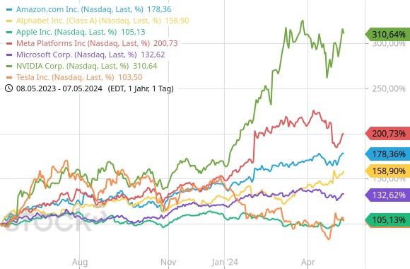 Wenn man den Börsenaufschwung der letzten Jahre betrachtet, dann ist er ohne die sogenannten „Magnificent 7“ kaum vorstellbar. Die Glorreichen Sieben, das sind Yul Brynner, Steve McQueen, Charles Bronson, Horst Buchholz, Robert Vaughn, Brad Dexter und James Coburn – zumindest in der Originalbesetzung aus dem Jahre 1960. Spaß beiseite, denn auch heute elektrisieren „Glorreiche Sieben“ die Märkte. Die neuen Stars heißen Amazon, Alphabet, Apple, Meta Platforms, Microsoft, Nvidia und Tesla. Der Begriff wurde von Michael Hartnett (Bank of America) geprägt, allerdings erst im Mai 2023. Es war ein weiterer, typischer Marketing-Begriff der US-Investmentbranche, mit dem die Anlegergemeinde für diese Aktien und die darauf aufgelegten Produkte begeistert werden sollte. Damit lösten die MAG7 die in die Jahre gekommenen FAANG- sowie die in Ungnade gefallenen BRICS-Investments als das neue heiße Ding ab. Schon bis zum Mai 2023 konnten die Glorreichen Sieben überzeugen. Danach waren es vor allem Nvidia (> +200%) und Meta Platforms (>+100%) welche der Gruppe weiter zu Glanz verhalfen. Dagegen schafften es Tesla und Apple lediglich, sich halbwegs durchzuschleppen. Sie waren nicht nur unter den Glorreichen die Schlusslichter, selbst hinsichtlich der breiten Marktindizes waren es Underperformer.