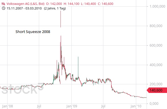 Volkswagen AG (2008): Der spektakulärste Short Squeeze in der deutschen Geschichte ereignete sich bei Volkswagen im Jahr 2008. Insbesondere die Volkswagen-Stammaktien (WKN: 766400) zogen immer weiter und scheinbar grundlos an, was Short-Seller auf den Plan rief. Als klar wurde, dass Porsche heimlich die Aktien kaufte, um die Kontrolle über VW zu erlangen, führte dies dazu, dass die Aktie innerhalb weniger Tage von etwa 200 Euro auf über 1.000 Euro stieg. Prominentestes Opfer dieses Short Squeeze war der Pharmaunternehmer Adolf Merckle, der sich nach horrenden finanziellen Verlusten das Leben nahm.