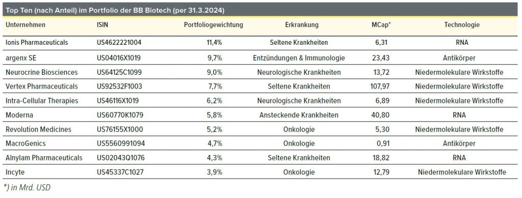 Koller: Eine Reihe von kleineren Beteiligungen hat sich in Erwartung bedeutender Meilensteine erholt. Unternehmen mit erheblichen Abschlägen bieten weiterhin beachtliches Aufwärtspotenzial. Ein herausragendes Beispiel hierfür ist unsere Position in MacroGenics, die im ersten Quartal 2024 zum NAV-Anstieg beigetragen hat. MacroGenics plant vo-raussichtlich die Veröffentlichung von Daten aus der Phase-II-Studie zu Vobra Duo, einem B7-H3-ADC-Wirkstoff, der aktuell bei Prostatakrebs in der Versuchsphase eingesetzt wird. Darüber hinaus gab es bedeutende Fortschritte bei Produktzulassungen und Indikationserweiterungen, wie die US-Zulassung von Casgevy zur Behandlung transfusionsabhängiger Beta-Thalassämie und die Zulassung von Vyvgart in Japan zur Behandlung der primären Immunthrombozytopenie.