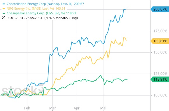 NRG Energy (WKN: A0BLR4) – ebenfalls ein US-Energieversorger, der einen ähnlichen Kurstrend wie Constellation Energy zeigt.