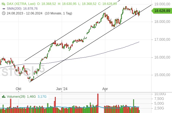 Nach der EU-Parlamentswahl ging es am Montag mit dem DAX erst einmal leicht abwärts. Eine echte Reaktion auf die Wahl war das zumindest in Deutschland nicht. Die Bewegungen blieben im Rahmen der normalen Schwankungen der letzten Wochen. Auch die erste Zinssenkung der EZB am vergangenen Donnerstag verpuffte mehr oder weniger. Der Markt ist richtungslos. Die besser als erwartet ausgefallenen US-Inflationszahlen (s.o.) sorgten zwar tatsächlich für Rückenwind, ein Befreiungsschlag aus der seit Mitte Mai andauernden Konsolidierung ist dies jedoch noch nicht. Vielmehr kämpft der deutsche Leitindex weiterhin mit der unteren Begrenzung des steilen Aufwärtskanals der letzten Monate.