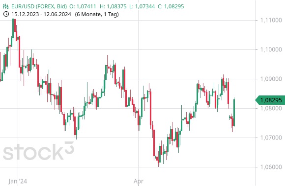 Der weiter rückläufige Kurs des Euro gegenüber dem US-Dollar dürfte ebenfalls nicht Folge des „Wahlbebens“ sein, das die Spatzen schon im Vorfeld von den Dächern pfiffen. Denn der Euro ging nicht erst am Montag mit einem Gap nach unten, sondern rutschte mit einer langen schwarzen Kerze bereits am Freitag ab. Da konnte die „Wahlüberraschung“ aber noch gar nicht bekannt sein. Ursächlich für diese Bewegung wird daher die Senkung des Schlüsselzinses von 4,5% auf 4,25% durch die EZB am Donnerstag gewesen sein. Die war tatsächlich ein bisschen überraschend, was man schon an der darauffolgenden Marktreaktion erkennen kann. Aktuell starren die Händler auf die heutige Fed-Sitzung. Eine Zinsänderung wird nicht erwartet. Die am Mittwoch um 14:30 Uhr vermeldeten US-Inflationsdaten waren mit +3,3% p.a. unter den Markterwartungen, was die Aktien unmittelbar mit einem kleinen Kurssprung quittierten. Auch der Euro legte sofort zu, was vielleicht doch auf einen Zinsschritt der Fed hindeuten könnte, auch wenn dieser unwahrscheinlich bleibt. Überraschungen für die Märkte kann es beim heutigen Powell-Statement aber immer geben, zumal zwischen den Zeilen sehr genau danach gesucht werden dürfte.