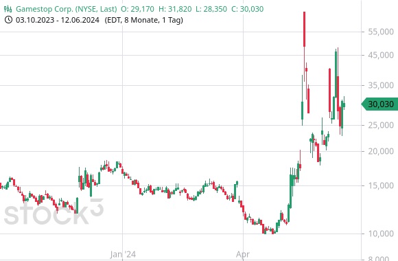 Ein Titel, der erneut die Gemüter erhitzte ist die Meme-Aktie GameStop (WKN: A0HGDX). Seitdem „Roaring Kitty“ alias Keith Gill die Szene wieder aufmischt, sind die erratischen Kursschwankungen wieder zurück. Wesentlich für dieses Spiel ist das Short Interest von rund 46 Mio. der 306 Mio. ausstehenden Aktien. Sobald der Kurs steigt, werden die „Shorties“ nervös. Allerdings wiederholt sich die Geschichte des Jahres 2021 nicht. Auf schnelle Spikes folgen ebenso schnelle Abverkäufe. Am vergangenen Freitag konnte nicht einmal ein Livestream von Gill die Verkaufswelle bremsen. Dagegen gab es bereits am Dienstag positive Nachrichten vom Unternehmen selbst. Man nutzte das zwischenzeitliche Interesse der Spieler und sammelte gut 2 Mrd. USD mit der Ausgabe neuer Aktien ein. So ist aus der Zockerei des Reddit-Schwarms eine real gefüllte Kasse des Unternehmens geworden. Diesmal stieg der Kurs im Sitzungsverlauf wieder um knapp 23% an. Zwar ist GameStop in keiner Weise „Investmentgrade“, in Sachen Unterhaltungswert ist das Papier aber kaum zu überbieten.