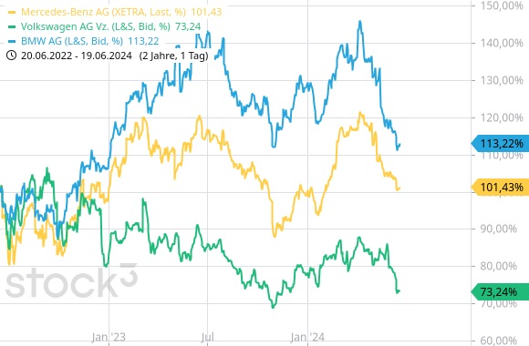 Dafür reagiert das schlaue Geld. Die substanzen Investoren entziehen Volkswagen Vz. (WKN: 766403), Mercedes (WKN: 710000) und BMW (WKN: 519000) ihre Gunst. Der langfristige Trend der Volkswagen-Aktie zeigt schon seit April 2021 (!) nach unten. Seit Anfang April verstärkt sich der Abwärtstrend, nun schwenken auch Mercedes und BMW ein, die sich bislang noch passabel gehalten hatten.