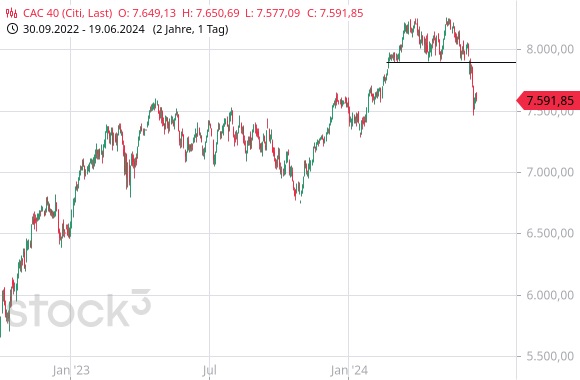 Noch schlechter sieht es beim französischen Gegenstück, dem CAC40 aus. Hier wurde mit dem Durchschlagen des Zwischentiefs bei ca. 7.900 Punkten und dem anschließenden kräftigen Kursrückgang ein Doppeltop vollendet. Die Kurse liegen jetzt wieder auf dem Niveau von April 2023. Einziger charttechnischer Lichtblick hier, das Mindestkursziel dieser Umkehrformation als der nach unten abgetragenen Differenz zwischen Kursspitzen und Zwischentief wurde bereits erreicht. Die Unsicherheit in Frankreich aufgrund der angekündigten Neuwahlen bleibt jedoch bestehen und auch die relative Schwäche gegenüber dem DAX legt hier keine Eile für einen Einstieg nahe.