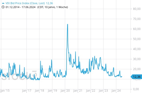 Der Volatilitäts-Index VIX zeichnet die Aktienkursausschläge des amerikanischen Blue-Chip-Index S&P 500 nach. Während der Corona-Panik im Frühjahr 2020 schießt der VIX hoch. Er kommt dann wieder zurück, verbleibt aber 2021 und 2022 auf leicht erhöhtem Niveau. Es ist die Zeit der Bankenkrisen, der Inflations- und Konjunktursorgen, des beginnenden Ukraine-Kriegs. 2023 geht der VIX weiter zurück und ist nun, im Frühjahr 2024, wieder dort unten angekommen, wo er in Vor-Corona-Zeit stand: Die Angst der Anleger ist auf Tiefstand. Denn der VIX lässt sich als Angstanzeiger begreifen. Je mehr Angst die Anleger um ihr Geld haben, umso stärker sind die Kursausschläge beim VIX.
