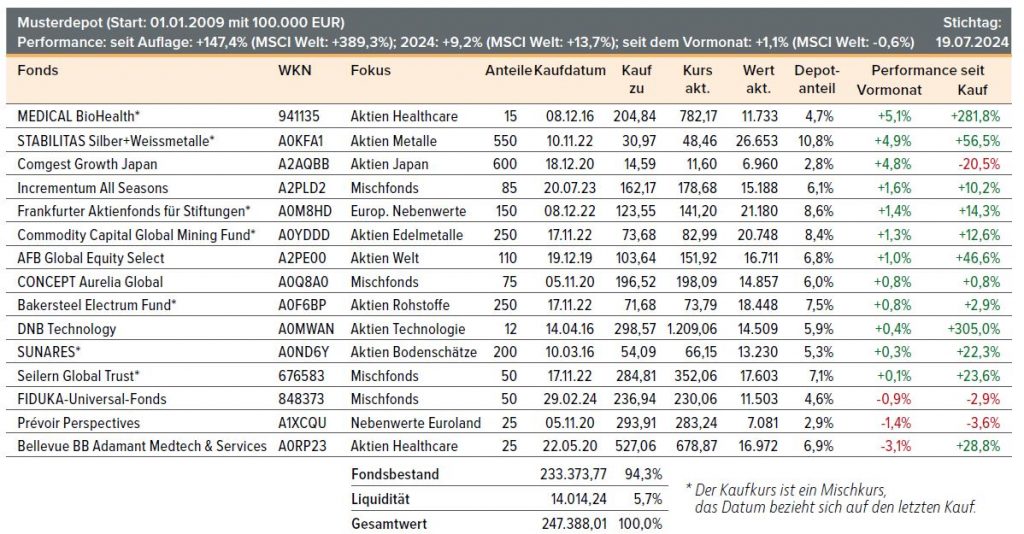 Verglichen mit dem Vormonat hat das Fondsmusterdepot ein Plus von 1,1% erzielt, der MSCI World EUR dagegen einen Verlust in Höhe von -0,6% verbucht. Die deutlichsten Ausschläge nach oben und nach unten gab es bei zwei Fonds mit Healthcare-Schwerpunkt. Der MEDICAL BioHealth (WKN: 941135) hat auf Monatssicht +5,1% gewonnen, der Bellevue BB Adamant Medtech & Services (WKN: A0RP23) dagegen -3,1% abgegeben. Das verdeutlicht, dass auch Fonds aus einem Sektor je nach Ausrichtung zur Diversifikation beitragen können. Weitere Details zum Fondsmusterdepot sowie zu anstehenden Käufen (KSAM-Value²; WKN: A2QAX5) und Verkäufen (SUNARES; WKN: A0ND6Y) können Sie unserem Newsletter Substanz Investor Weekly vom 24.7. entnehmen.