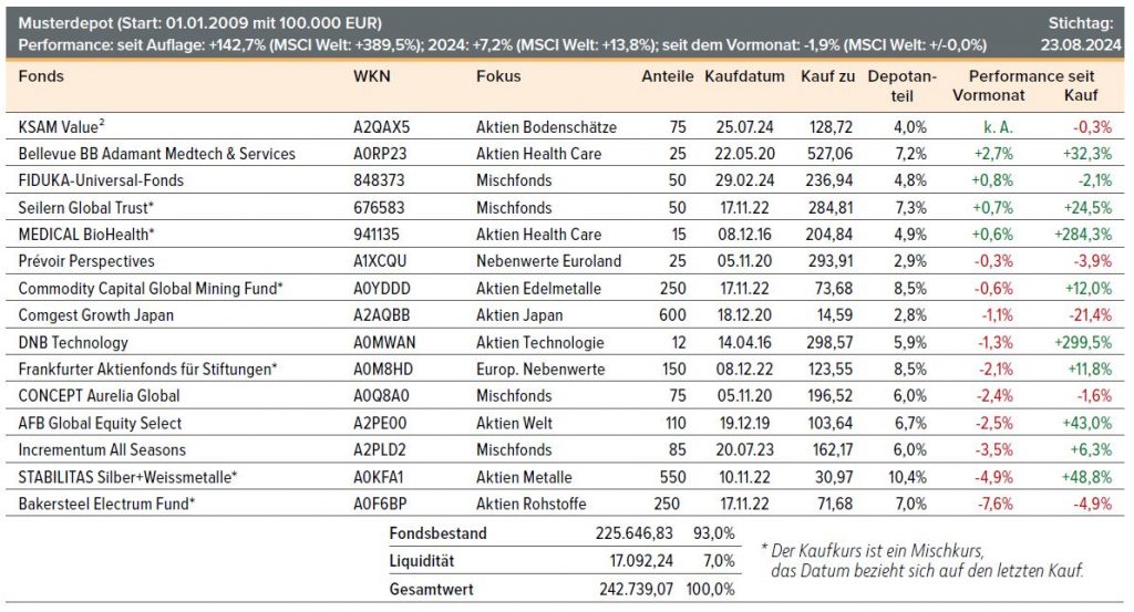 Im Vergleich zum Vormonat hat das Fondsmusterdepot ein Minus von 1,9% erzielt, während der MSCI World EUR unter dem Strich sein Niveau halten konnte. Vor allem Minenaktienfonds erwiesen sich als Belastung für das Fondsportfolio. Die rote Laterne trägt mit -7,6% der Bakersteel Electrum Fund (WKN: A0F6BP). Die Investitionen des Fonds erstrecken sich von Edelmetall- über klassische Industriemetallminen bis hin zu Unternehmen, die Rohstoffe für die Energiewende bereitstellen. Hier hatten u.a. die deutlichen Kursrückgänge bei Uranaktien wie Cameco, die zu den Toptiteln des Portfolios zählt, auf die Performance gedrückt.