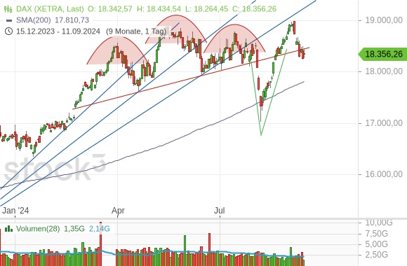 Wie in der Vorwoche beschrieben hat sich das Chartbild für den DAX nach dem Fehlausbruch über 19.000 Punkte eingetrübt. Es war nicht zu erwarten, dass nach einem solchen Signal einfach zur Tagesordnung übergegangen werden kann. Tatsächlich rutschte der deutsche Leitindex denn auch weiter ab. Inzwischen befindet er sich wieder in der breiten Schiebezone/Top-Bildung und landete zuletzt unterhalb der Nackenlinie (rot) der Schulter-Kopf-Schulter-Formation. Diese Linie ist zwar aus charttechnischer Sicht nicht mehr sonderlich bedeutsam, da sie durch den ersten Ausbruch und die anschließende Rückeroberung im August bereits zweimal verletzt worden war. Eine Bestätigung der aktuellen Marktschwäche ist der mühelose Durchbruch aber schon. Saisonal wird der DAX weiter keine Unterstützung erwarten können. Ob die anstehenden Zinssenkungen, eigentlich die Kommentare der Notenbanker zum weiteren Vorgehen nach den Zinssenkungen, helfen werden, wissen wir dann am Ende der kommenden Woche. Bis dahin dürfte Vorsicht der bessere Teil des Mutes bleiben.