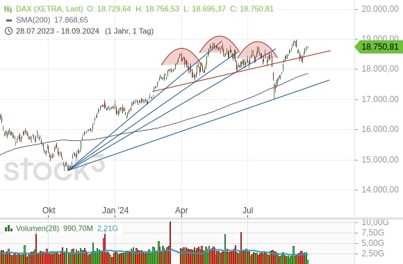 Bedeutsamer scheint aktuell die große Schiebezone zu sein, die zwar durchaus das Potenzial hat, Teil einer Top-Bildung zu sein, aber im Moment kein Signal in dieser Richtung gibt. Der neutralere Begriff der Schiebezone lässt ganz bewusst offen, ob sich der deutsche Aktienindex daraus nicht auch nach oben herausarbeiten könnte. Das allerdings ist im Moment nur Spekulation.