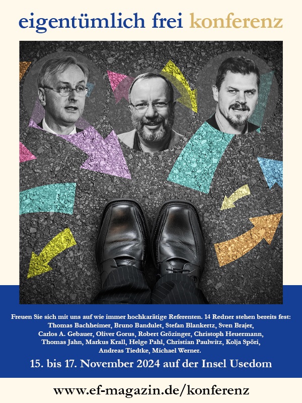 Das Monatsmagazin eigentümlich frei lädt Sie herzlich ein zur achten großen ef-Konferenz an der Ostsee inklusive feierlicher Vergabe der zehnten Julius-Faucher-Medaille für Jungautoren und des fünften Libertären Literaturpreises! Erleben Sie richtungsweisende Vorträge von Markus Krall, Thomas Bachheimer und vielen anderen meinungsstarken Rednern in einer entspannten Atmosphäre, nutzen Sie die Gelegenheit, Kontakte zu knüpfen, und genießen Sie das unvergleichliche All-inclusive-Paket einer einzigartigen Veranstaltung in Zinnowitz auf der Insel Usedom.