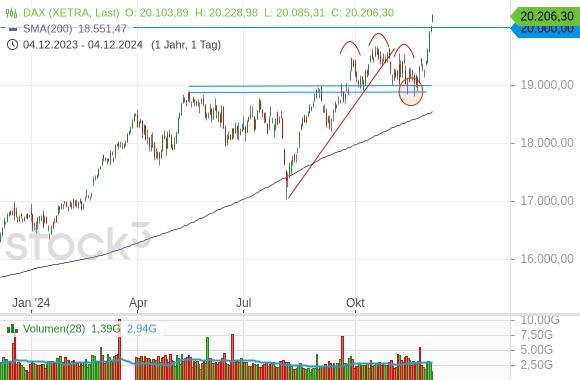 Trotz dieser kritischen Vorrede zum deutschen Leitindex DAX müssen wir natürlich feststellen, dass eine weitere, zumindest psychologisch wichtige Marke mit Bravour genommen wurde. 20.000 Punkte sind ein Statement, an dem man erst einmal nicht vorbeikommt. Zwei kleine technische Haare in der Suppe gibt es allerdings. Die Geschwindigkeit der Aufwärtsbewegung ist zu hoch, um durchgehalten zu werden. Insbesondere kam der Index nicht gerade ausgeruht an der 20.000er an. Außerdem erfolgte der eigentliche Durchbruch, wie schon der Aufschwung bis dahin, mit Umsätzen, die eher unauffällig sind, keinesfalls jedoch der historischen Bedeutung dieses Ereignisses gerecht werden. Möglicherweise sind derzeit zu viele Hoffnungen auf eine Jahresendrally und eine künftige, wirtschaftskompetente Regierung im Markt? Eine wichtige Feuertaufe für diesen Aufschwung kommt in den ersten Handelstagen des Januars, wenn die Bücher frisch geöffnet werden.