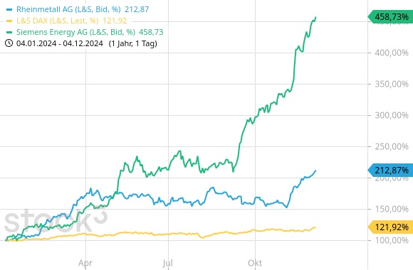 Grüner TurnaroundVor dem Hintergrund einer derart drastischen Einschätzung sind die DAX-Rekorde erklärungsbedürftig. Natürlich muss es in einem Index, der seit dem Jahresende 2023 um rund +19,5% zugelegt hat und der zudem einige große Jahresverlierer umfasst auch große Gewinner geben. An erster Stelle steht hier Siemens Energy (WKN: ENER6Y) mit einem Plus von +327%. Dies ist allerdings in zweifacher Hinsicht nicht typisch für die deutsche Wirtschaft insgesamt. Der Konzern hatte sich mit der Übernahme der spanischen GAMESA ordentlich verhoben. Der Aktienkurs stürzte dramatisch ab und erreichte im vierten Quartal 2023 seinen Tiefkurs. Ab da ging es bei dieser Turnaround-Geschichte fast kontinuierlich nach oben, nicht zuletzt auch deshalb, weil das Unternehmen im Rahmen der grünen Transformation ordentlich politischen Rückenwind hatte. Das Indexgewicht von 2,29% ist allerdings überschaubar.