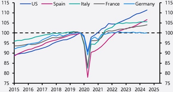 Problem Nr. 1: EU-WachstumsschwächeEuropas Wirtschaft leidet seit Jahren unter anämischem Wachstum. Besonders Deutschland fällt mit einer Wirtschaftskraft auf dem Niveau von Ende 2019 negativ auf – fünf Jahre ohne realen Zuwachs. Auch Frankreich und Italien verzeichnen über diesen Zeitraum per Saldo nur geringe Steigerungen von +4,1% bzw. +5,6%, während Spanien auf +6,6% Wachstum kam. Zum Vergleich: Die US-Wirtschaft wuchs im gleichen Zeitraum um +11,4%.