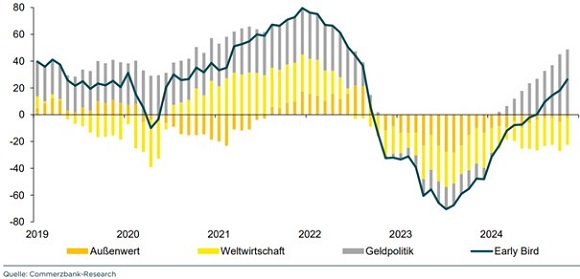 Darüber hinaus verweist die Commerzbank auf monetäre Indikatoren, die sich zuletzt stetig verbessert haben. So war die Geldmenge M1 jüngst mit einem Plus von 0,2% erstmals seit zwei Jahren wieder größer als im entsprechenden Vorjahresmonat, während sie vor einem Jahr noch um 10% geschrumpft war.