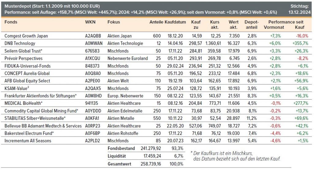 Verglichen mit dem Vormonat hat sich im Fondsmusterdepot mit +0,8% per Saldo wenig getan. Auch beim MSCI World EUR (+0,6%) ist vorweihnachtliche Stille eingekehrt. Allerdings gab es im Depot auch Ausschläge: Der Comgest Growth Japan (WKN: A2AQBB; +7,3% auf Monatssicht) hat sich am deutlichsten bewegt. Zum Plus haben etwa zweistellige prozentuale Kursgewinne bei Top-Holdings wie dem u.a. als Personaldienstleister tätigen Konzern Recruit Holdings und der Sony Group beigetragen. Die Ausschüttung in Höhe von 2,22 EUR pro Anteil beim Frankfurter Aktienfonds für Stiftungen (WKN: A0M8HD) wurde der Liquidität zugeschlagen.