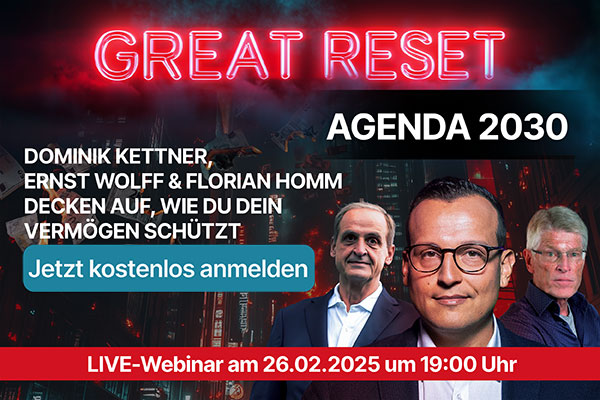 Ein weiteres hochinteressantes Webinar, bei dem Sie sich beeilen sollten, veranstaltet Kettner Edelmetalle. Unter dem Titel „Great Reset – Agenda 2030“ diskutieren Dominik Kettner, Florian Homm und Ernst Wolff am 26.2. ab 19:00 Uhr darüber, wie Sie Ihr Vermögen schützen können. Bitte beachten Sie auch dazu auch die zweite die Anzeige in diesem Newsletter. Das Webinar ist kostenlos und hier geht es zur Anmeldung.