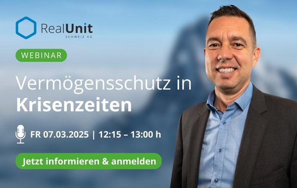 Die RealUnit Schweiz AG lädt am 7.3. von 12:15 bis 13:00 Uhr zum kostenlosen Vortrag „Vermögensschutz in Krisenzeiten“. CEO Dani Stüssi erläutert die wichtigsten Aspekte und Vorteile seiner Sachwertstrategie. Nähere Informationen zu diesem Webinar erhalten in der ersten Anzeige in diesem Newsletter und auf der Web-Präsenz von Real Unit.