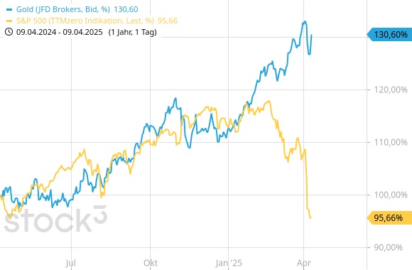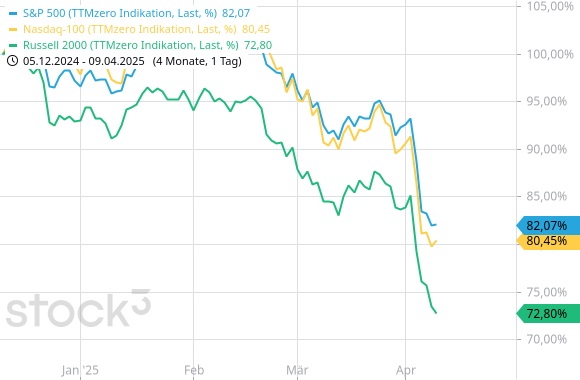 Möglicherweise ist der US-Präsident hinsichtlich der „unpatriotischen“ Reaktion der US-Märkte selbst ein wenig überrascht, denn diese zeigten sich alles andere als begeistert über die ungebetene Schützenhilfe aus dem Weißen Haus. Man nennt es wohl „Friendly Fire“. Der zuvor bereits angeschlagene S&P 500 stürzte seit der Ankündigung in der Spitze um knapp 15% ab. Seit dem Allzeithoch von 6.147 am 19.2. ist der S&P sogar um mehr als 21% gefallen und damit offiziell im Bärenmarkt. Im NASDAQ100 beträgt der Abstand zwischen Verlaufshoch und Verlaufstief sogar mehr als 25%. Getoppt bzw. gefloppt wird dieses Ergebnis noch vom RUSSELL 2000, der sein Allzeithoch bereits am 25.11.24 erreichte: minus 27,7%. Trump hat also den heimischen Börsen einen echten „Bärendienst“ erwiesen. Zu den größten Verlierern gehörten Sektoren wie Technologie und Konsumgüter, insbesondere Unternehmen wie Apple und Nike, die stark von globalen Lieferketten abhängig sind. Defensive Sektoren wie Versorger zeigten relative Stabilität, da Anleger in stabile, dividendenstarke Aktien flohen. Das Ganze ist deshalb pikant, weil ein Großteil der Altersvorsorge der US-Arbeiterschaft, die Trump durch die Maßnahmen zu schützen vorgibt, in genau diesen Aktienmärkten investiert ist.